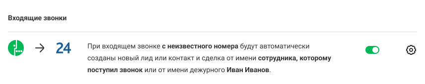 1. Чтобы при новом входящем или исходящем звонке в Битрикс24 автоматически создавался лид или сделка с контактом, нужно включить создание этих сущностей в АТС.