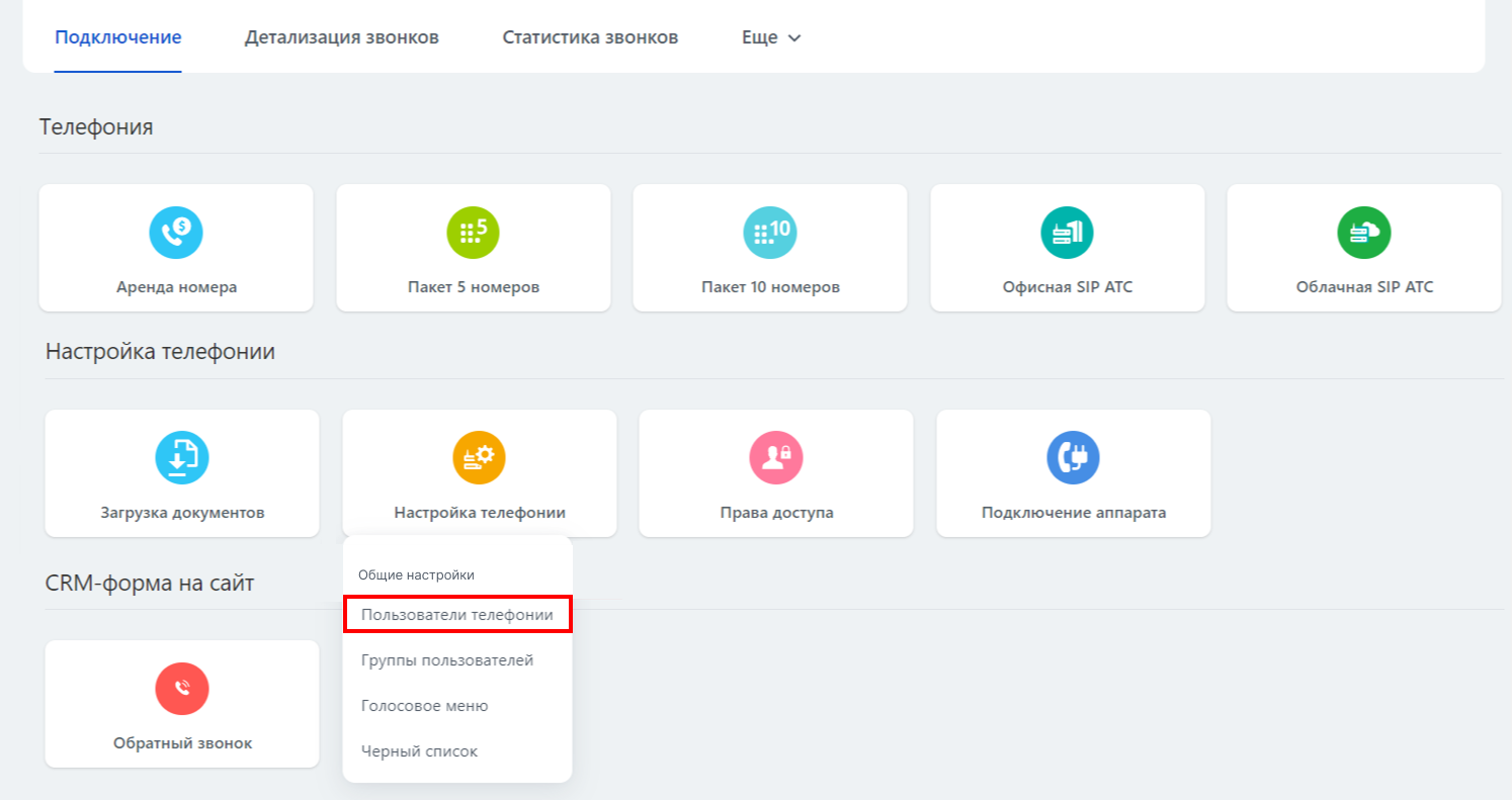 Для удобства можно закрепить номер, который сотрудник использует чаще всего, — система будет автоматически подставлять его в качестве исходящего. Для этого перейдите в раздел «Настройки телефонии» — «Пользователи телефонии».
