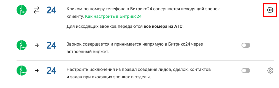 Чтобы скрыть в виджете недоступные для сотрудников номера: 1. В АТС перейдите в раздел «Интеграция с CRM» — «Битрикс24». В блоке «Для всех сценариев» напротив сценария с виджетом нажмите на шестеренку.