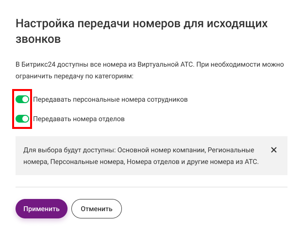 2. Выберите, какие категории исходящих номеров не будут отображаться в Битрикс24: персональные номера и/или номера отделов.