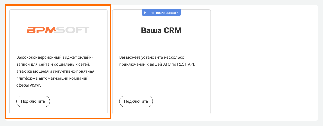 6. В вашей АТС зайдите в меню «Интеграция с CRM». Найдите виджет BPMSoft и кликните на него.
