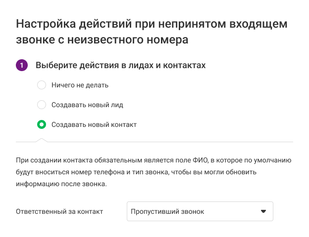 Также для отдельных типов звонков можно создавать контакты, задачи, обращения, а пропущенные в IVR можно фиксировать на конкретного сотрудника.