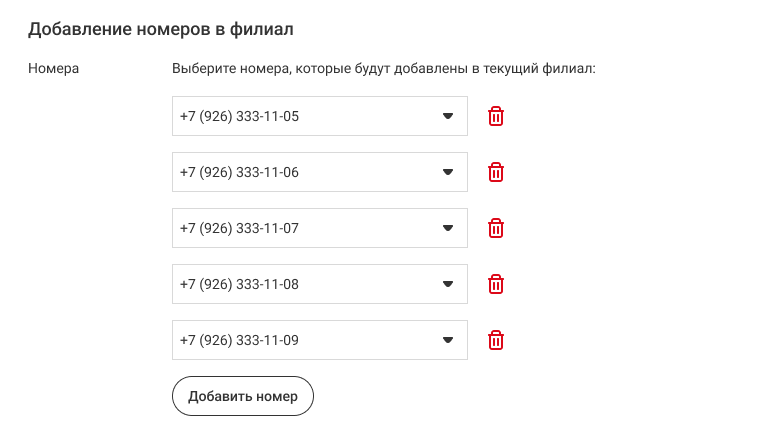 4. Для добавления еще одного номера нажмите на кнопку «Добавить номер». Чтобы удалить случайно добавленный номер, нажмите на корзину справа.