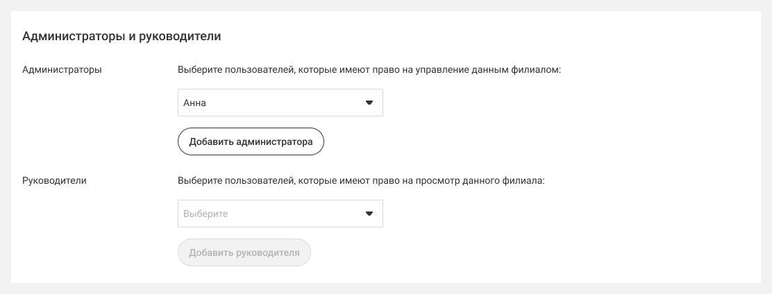 5. Настройте доступы к филиалу. Вы можете добавить новых администраторов и руководителей из сотрудников с логином АТС.