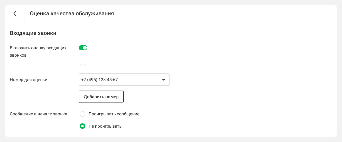 2. Включите оценку входящих звонков. В появившемся поле укажите номера АТС или номерные группы, на которые будут поступать вызовы, подлежащие оценке. Система будет автоматически предлагать клиентам оценить разговор после завершения беседы.