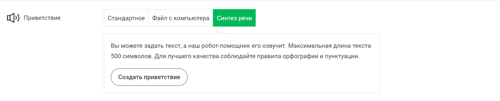 Вы можете заменить приветствие в любой момент, отредактировав текст сообщения на вкладке «Синтез речи». Также вам всегда доступно стандартное приветствие и возможность загрузить до 40 собственных файлов приветствий.